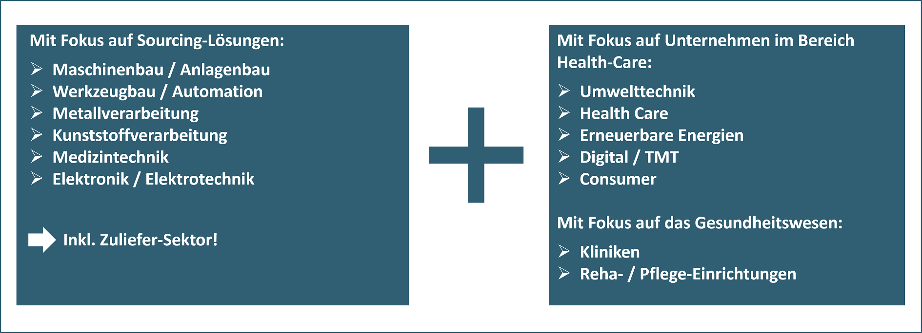 Die Kombination der Märkte unserer Kunden und Geschäftspartner beinhaltet attraktive Synergie-Potentiale. Vor diesem Hintergrund unterstützen wir unsere Kunden stets bei der Realisierung von Synergien im Umfeld unserer Kunden und Branchen-Schwerpunkte.
